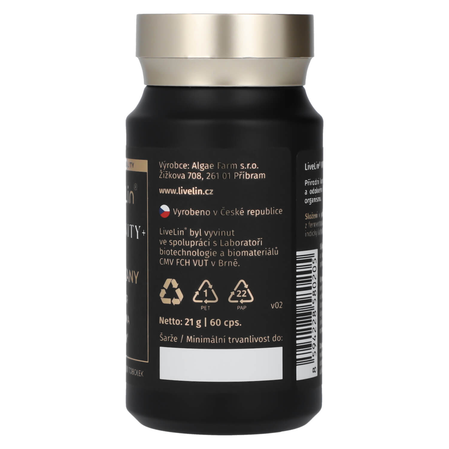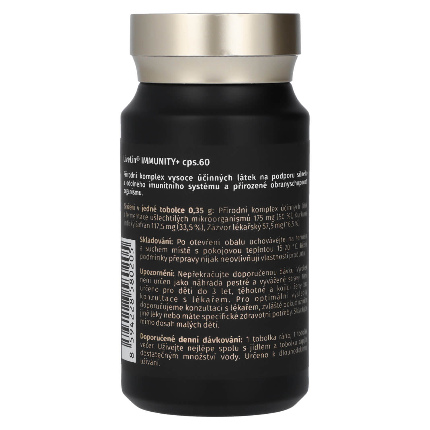 LiveLin® Immunity+ je komplex vysoko účinných látok s vysokou vstrebateľnosťou a synergickými účinkami jednotlivých zložiek. Zmes je uložená v enterickej kapsule, ktorá poskytuje dokonalú ochranu proti biodegradácii aktívnych látok žalúdočnou kyselinou. Obsahuje najsilnejšie prírodné imunostimulanty, antioxidanty, protizápalové látky a ďalšie zložky, ktoré podporujú dlhodobé zdravie a odolnosť voči chorobám. Na rozdiel od synteticky vyrábaných produktov na posilnenie imunity, ktoré často nemajú žiadny významný vplyv na zdravie.