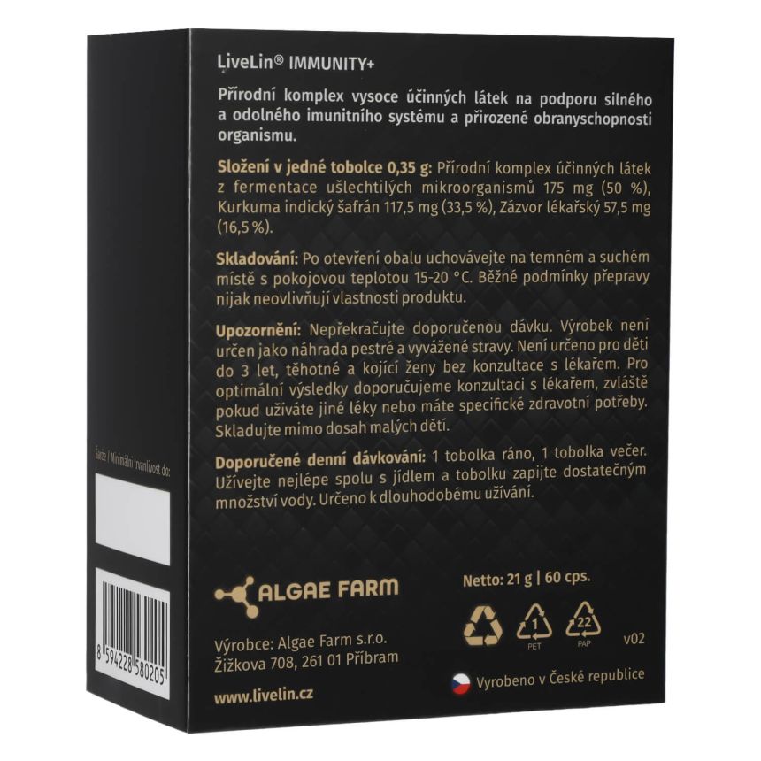 Doplnok stravy LiveLin® Immunity+ je čisto prírodný komplex beta-glukánov, extraktu z kurkumy, extraktu zo zázvoru a unikátnej mikronizovanej biomasy, vyrobený biotechnologickým fermentačným procesom, ktorý využíva ušľachtilé mikroorganizmy na výrobu aktívnych látok nevyhnutných pre imunitu a trvalé zdravie. Produkt neobsahuje žiadne prísady, farbivá, arómy ani stabilizátory.