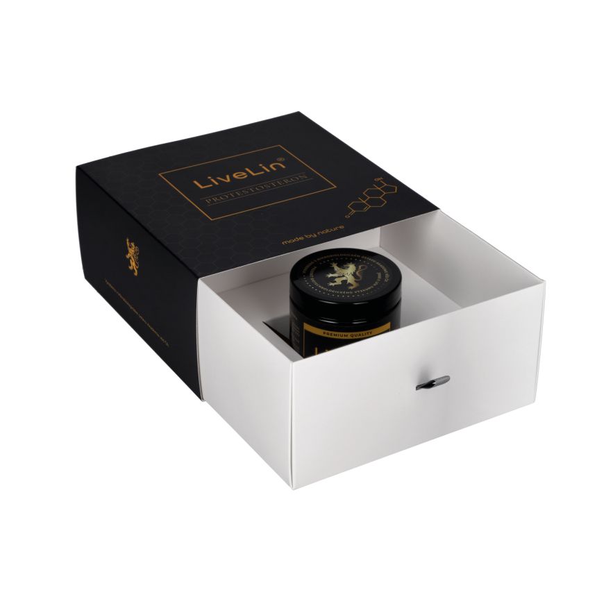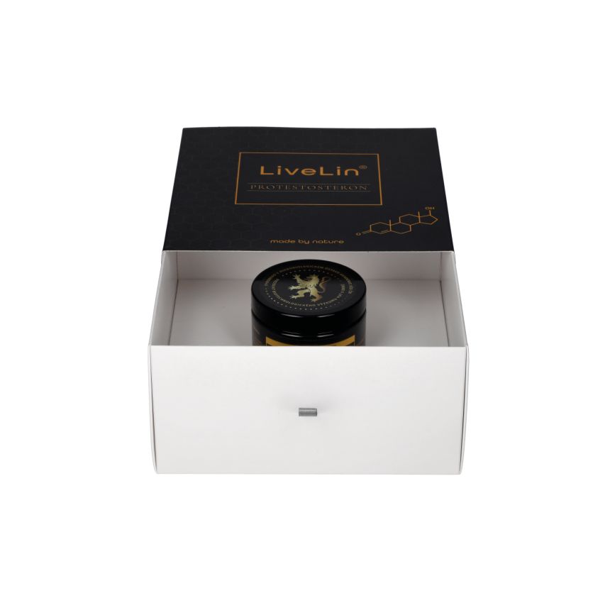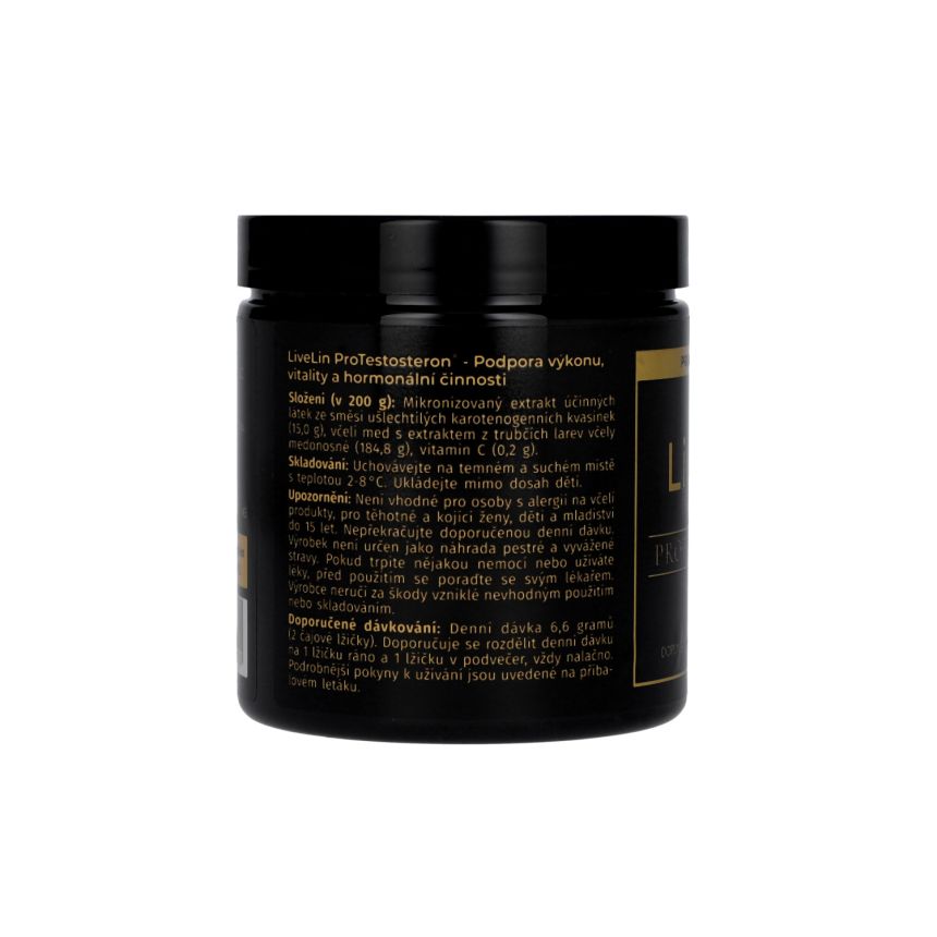 Výživový doplnok LiveLin® ProTestosterone je čisto prírodná zmes lyofilizovaného extraktu z lariev včely medonosnej (v ranom štádiu larválneho vývoja) a mikronizovanej biomasy, vyrobenej biotechnologickým fermentačným procesom, ktorý využíva ušľachtilé kvasinky na výrobu účinných látok nevyhnutných pre dlhovekosť a trvalé zdravie. Zmes je uložená v medovej emulzii na dokonalú ochranu pred biodegradáciou účinných látok. Výrobok neobsahuje žiadne prídavné látky, farbivá, arómy ani stabilizátory.