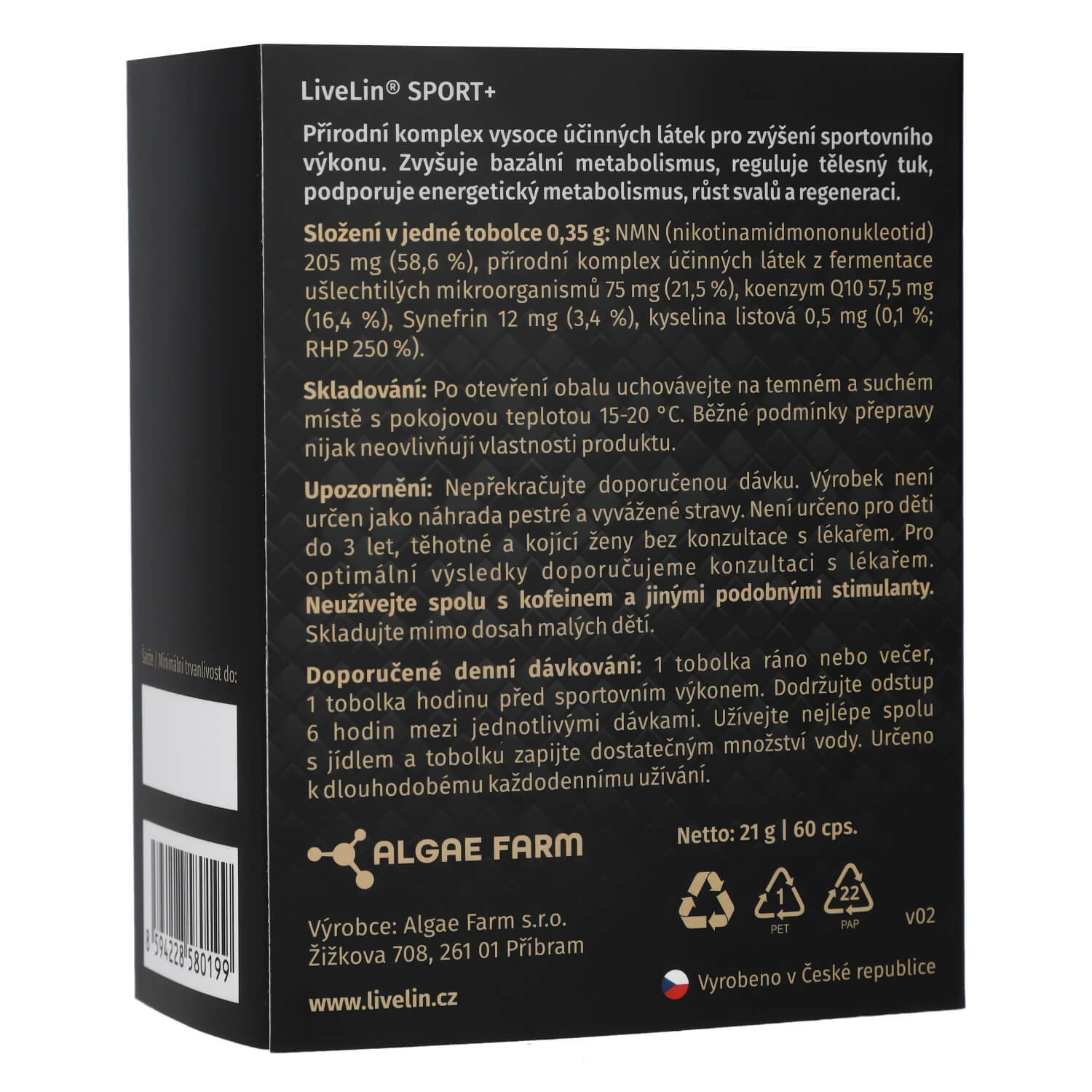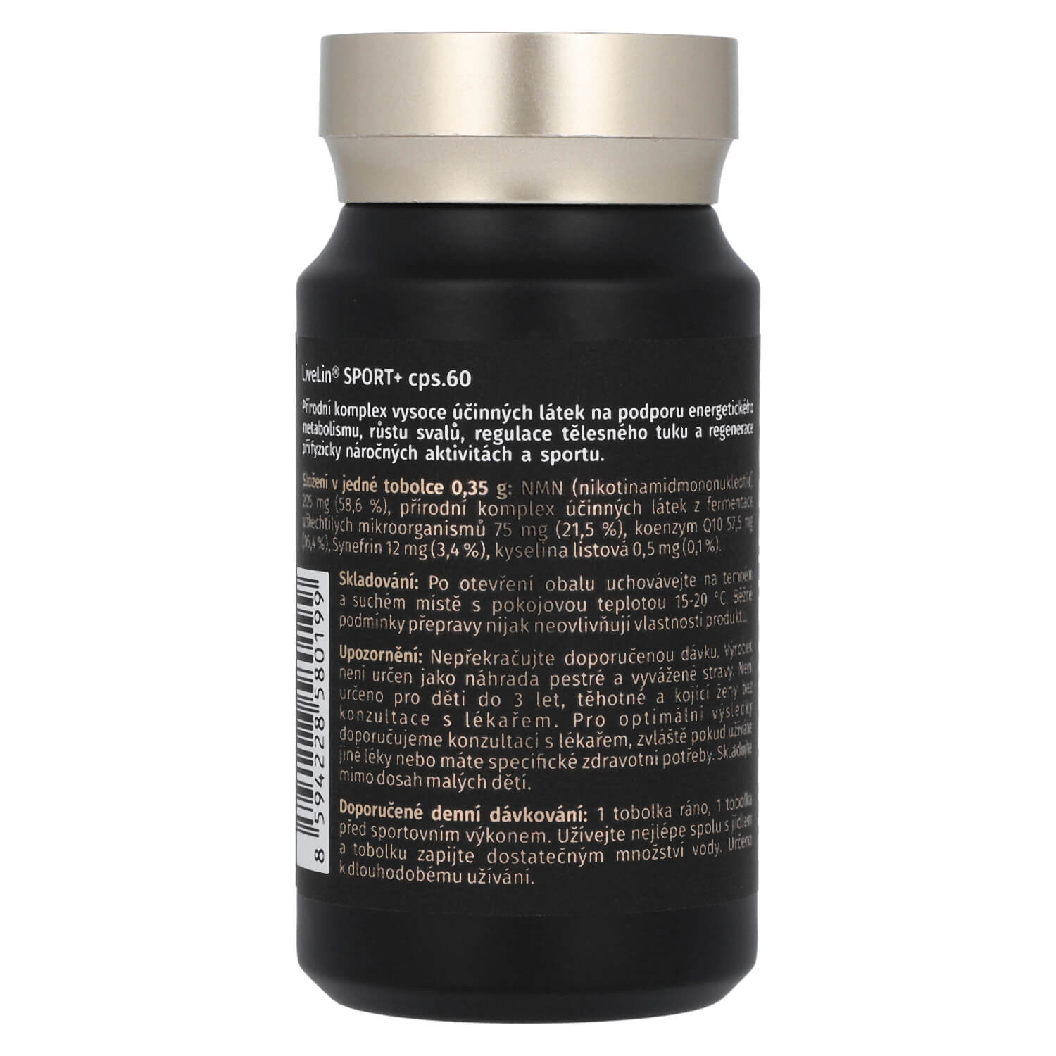 LiveLin® Sport+ je prémiový doplnok stravy vo forme kapsúl, vyvinutý pre aktívnych ľudí a športovcov, ktorí chcú posunúť hranice svojej fyzickej výkonnosti a regenerácie. Kombinuje najmodernejšie, úplne prírodné zložky, ktoré podporujú energetický metabolizmus, vitalitu a fyzickú vytrvalosť. Obsahuje LiveLin®, unikátnu mikronizovanú biomasu vyrobenú biotechnologickým fermentačným procesom, ktorý využíva ušľachtilé mikroorganizmy na výrobu aktívnych látok nevyhnutných pre trvalé zdravie a dlhovekosť. Produkt neobsahuje žiadne prísady, farbivá, arómy ani stabilizátory.